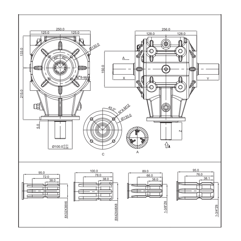KLF250 hastighetsökande växellåda är 1: 3, det kan anpassas till många olika typer av jordbruksmaskiner och utrustning, Mulcher Straw Crusher-maskiner, maskiner för återhämtning av jordbruksrester och så vidare. Gleason -avfasningsväxlarna bearbetas med hög precision, med hög meshing precision, liten transmissionsförlust och hög energiöverföringseffektivitet. Input hastighet 540R/min, utgångshastighet 1620r/min, nominell effekt 80 hk, maximal effekt 100 hk